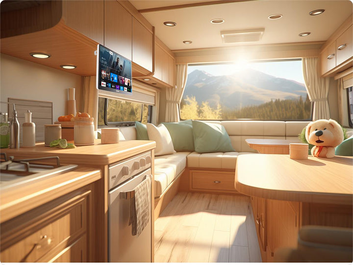 Can be powered by DC 12V. It's suitable for placement in the kitchen, bedroom, RV camper, kid's room, or wherever needed, offering convenient viewing experience.