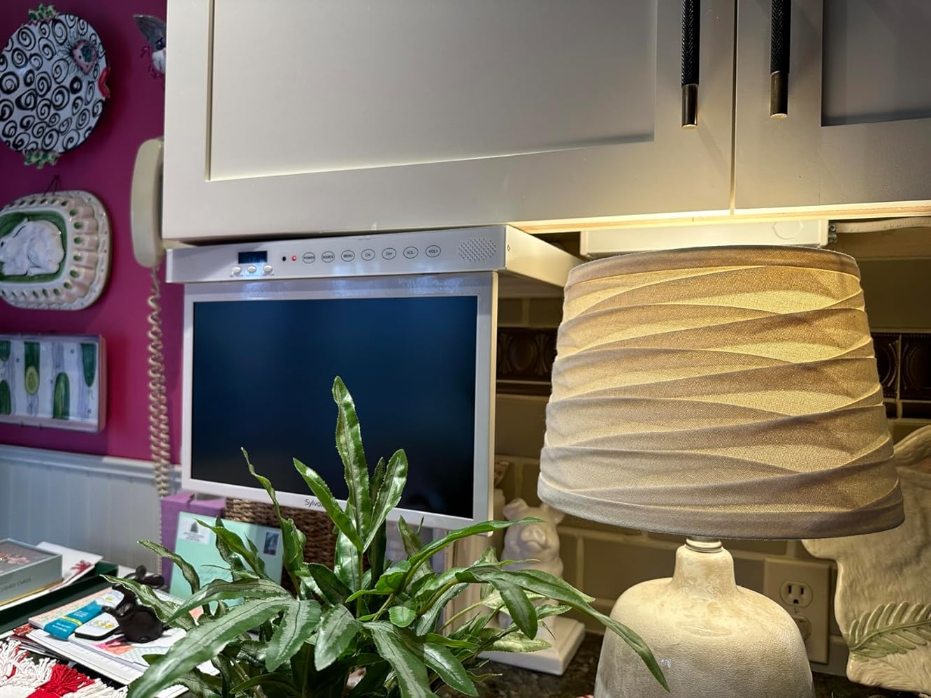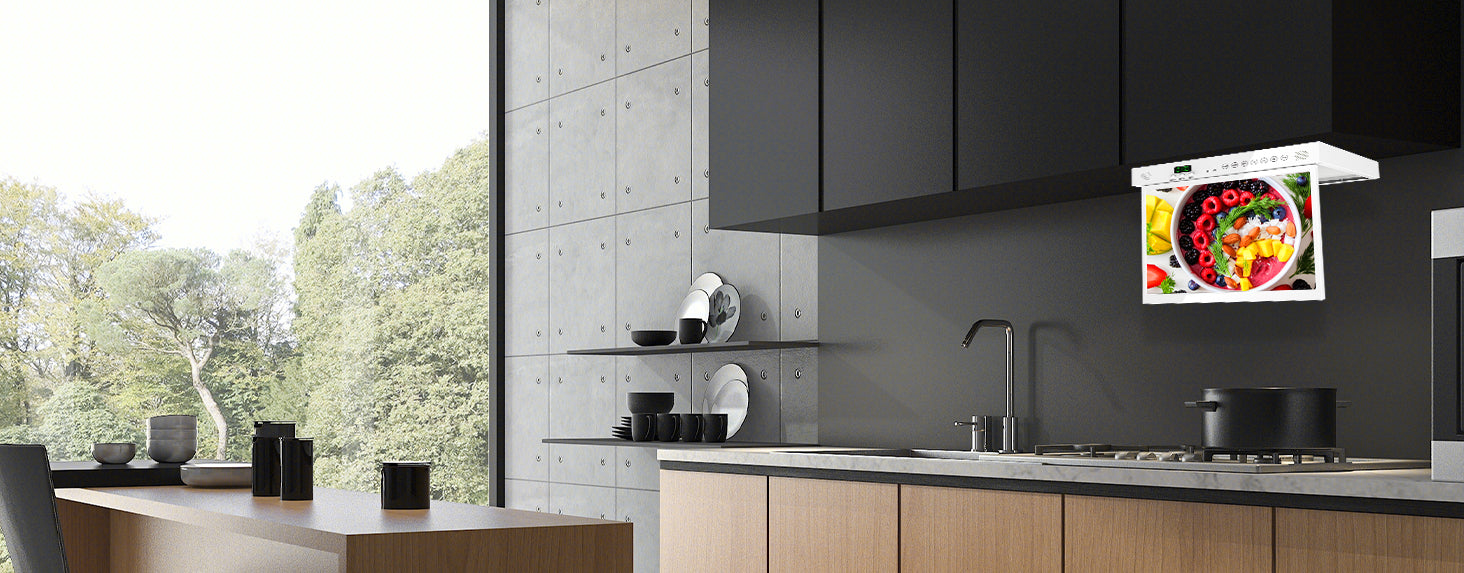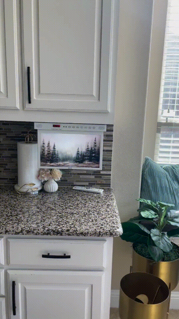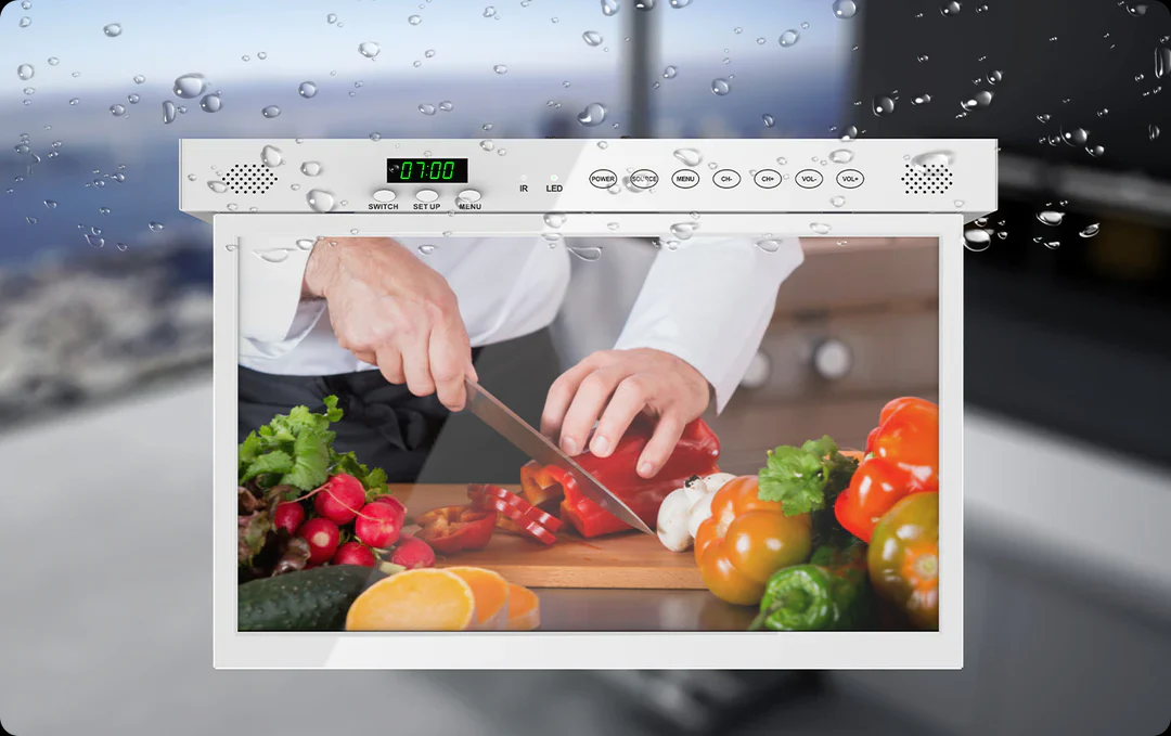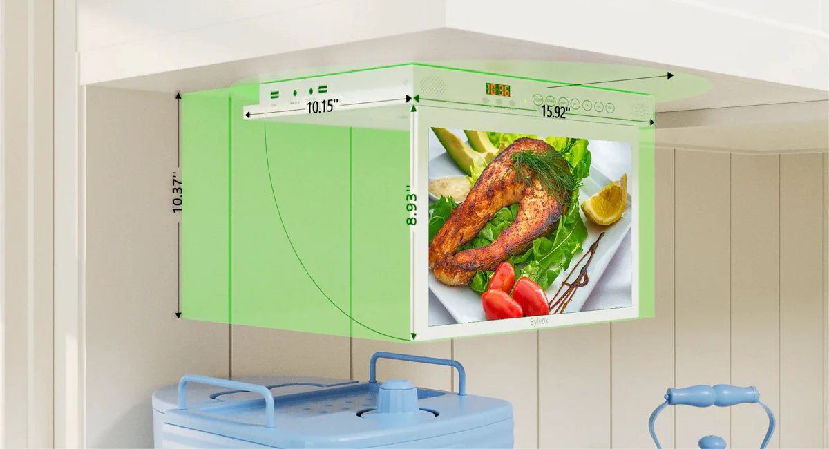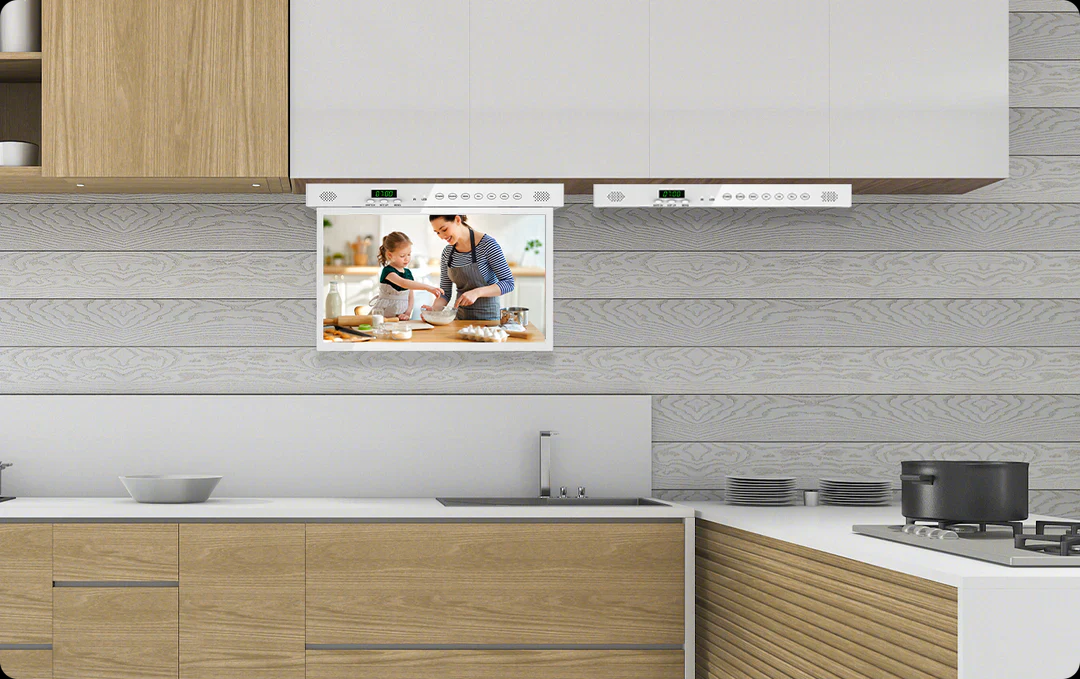 The Sylvox fold-down kitchen TV can be folded to save space and unfolded when needed. It offers a 90° flap-down angle and 360° screen rotation, allowing you to adjust the viewing angle and install it under cabinets or ceilings for maximum convenience.