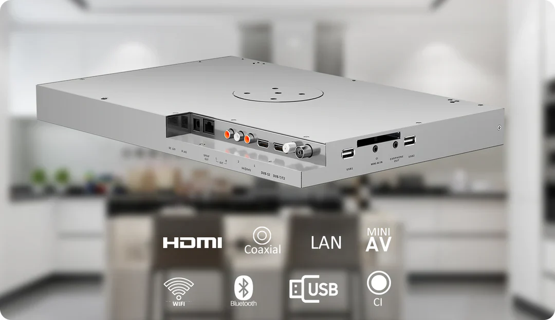 Supports both WiFi and Bluetooth for easy wireless connections, along with DVB-S2 and DVB-C/T/T2 interfaces for satellite, external antennas, and COAX, offering versatile viewing options. Multiple cable connections let you get the most out of your small TV.