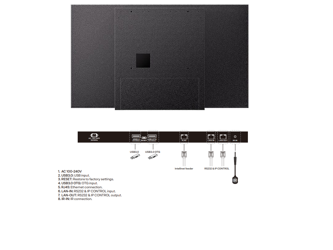 Equipped with 2× USB (USB 3.0 ×1, USB 3.0 OTG ×1), 1× RJ45, LAN In ×1, LAN Out ×1, IR In ×1, it offers flexible connection for different devices and easy integration with external devices.