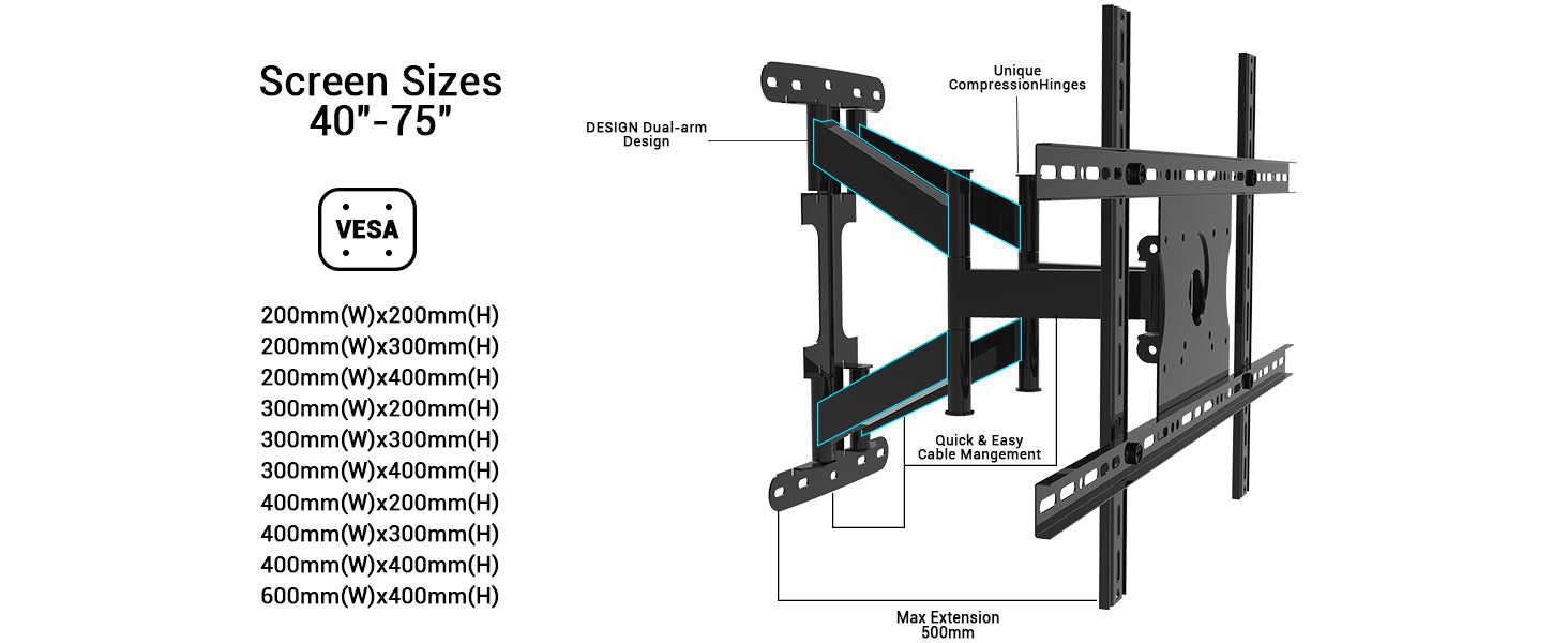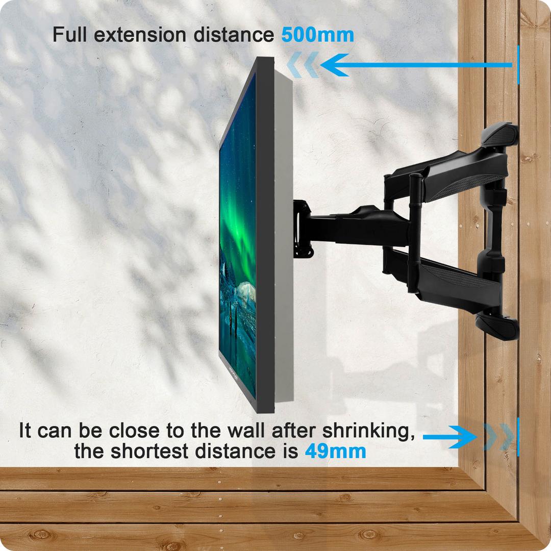 You can swivel wall mount +/1 45° to adjust your viewing angle. Flexible 6 articulating dual arms can extend up to 19.6"/500mm and retract back to 1.9"/49mm properly. Enjoy the best viewing angle anytime and anywhere